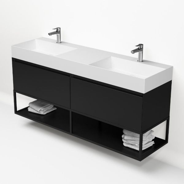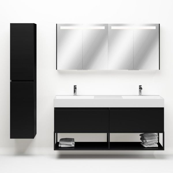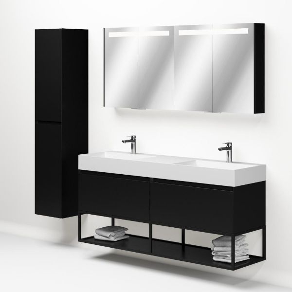 | | Bellanti Solo/Tela/Azzurra badmeubel 160x46 2 softclose laden mat zwart greeploos keramiek dubbele wastafel mat wit met 2 kraangaten met mat zwart metalen frame |