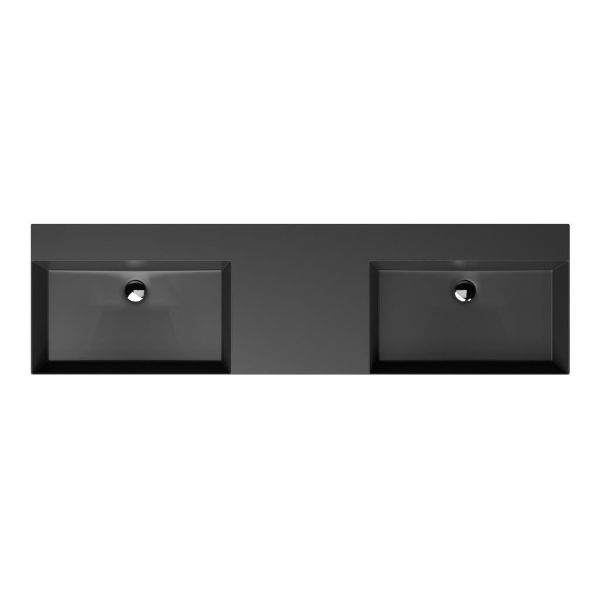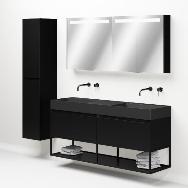 Greeploos badkamermeubel in de kleur zwart mat is 160 cm breed. De wastafel is vervaardig in keramiek en heeft de kleur antraciet mat keramiek. Dit badkamermeubel met deze wastafel is leverbaar tussen de 60 cm t/m 140 cm