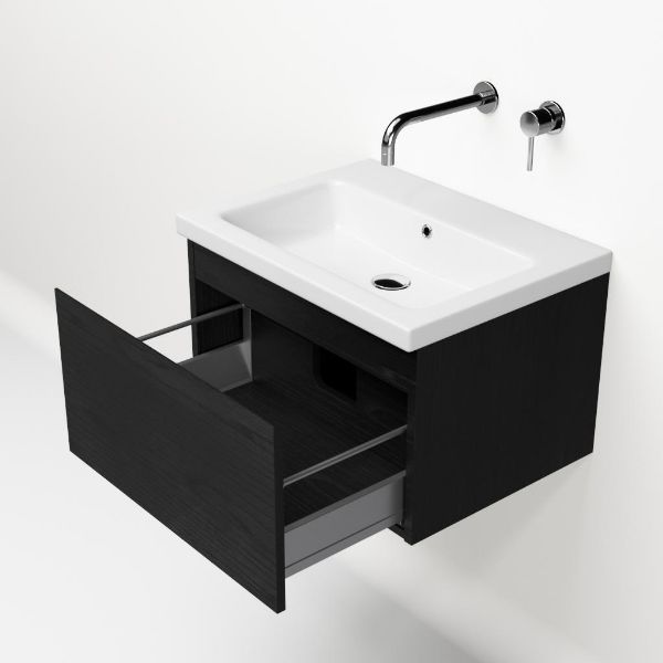 | Bellanti Solo/Amelia badmeubel 60x46 1 softclose lade mat zwart eiken greeploos keramische wastafel wit glans zonder kraangaten |