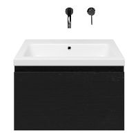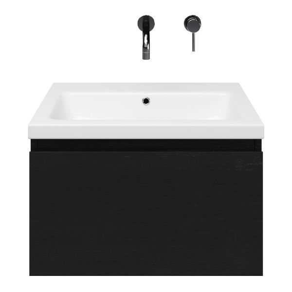 Greeploos badkamermeubel in de kleur zwart mat eiken is 60 cm breed. De wastafel is vervaardig in keramiek en heeft de kleur wit keramiek. Dit badkamermeubel met deze wastafel is leverbaar tussen de 60 cm t/m 140 cm
