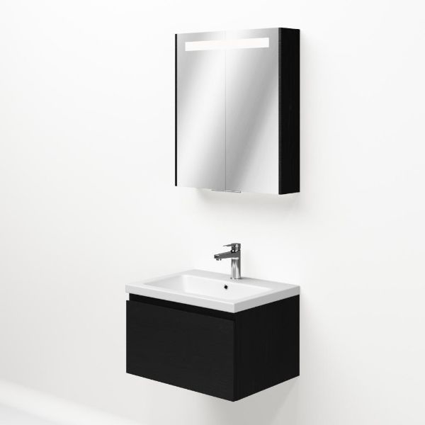 Greeploos badkamermeubel in de kleur zwart mat eiken is 60 cm breed. De wastafel is vervaardig in keramiek en heeft de kleur wit mat keramiek. Dit badkamermeubel met deze wastafel is leverbaar tussen de 60 cm t/m 140 cm