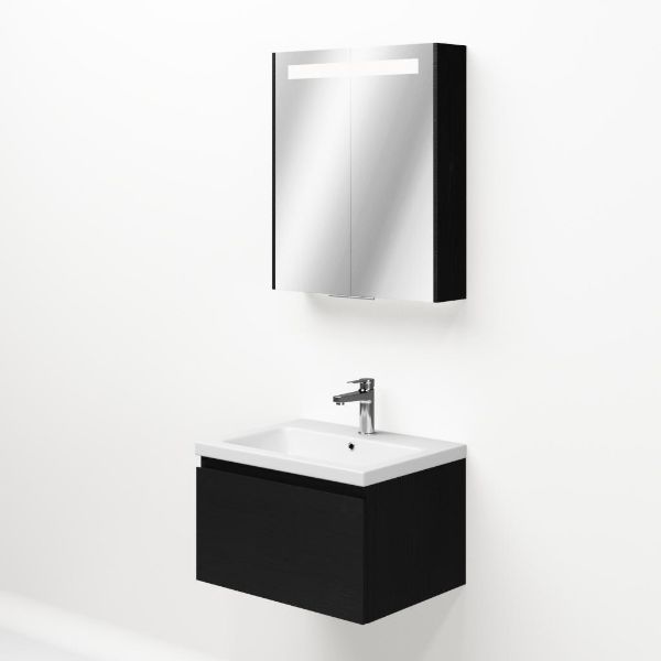 Greeploos badkamermeubel in de kleur zwart mat eiken is 60 cm breed. De wastafel is vervaardig in keramiek en heeft de kleur wit keramiek. Dit badkamermeubel met deze wastafel is leverbaar tussen de 60 cm t/m 140 cm