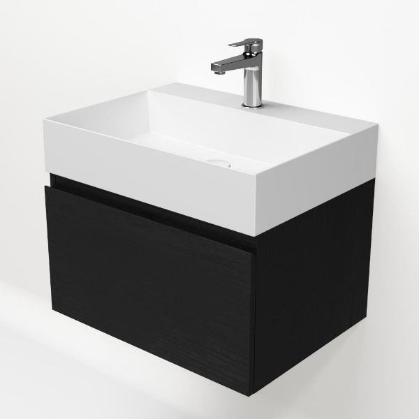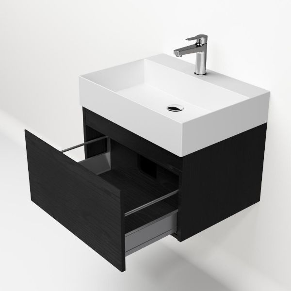 | | Bellanti Solo/Azzurra badmeubel 60x46 1 softclose lade mat zwart eiken greeploos keramische wastafel wit mat met 1 kraangat |