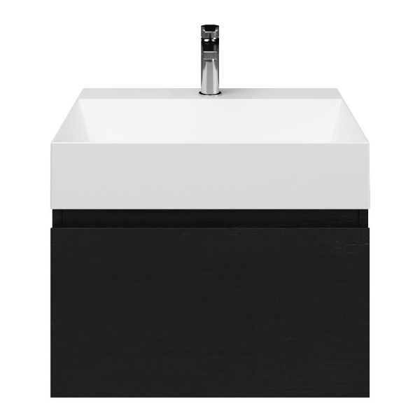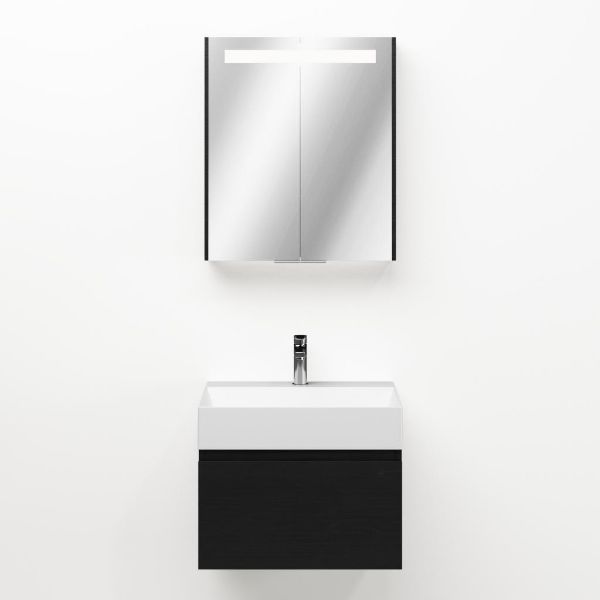 Greeploos badkamermeubel in de kleur zwart mat eiken is 60 cm breed. De wastafel is vervaardig in keramiek en heeft de kleur wit mat keramiek. Dit badkamermeubel met deze wastafel is leverbaar tussen de 60 cm t/m 160 cm