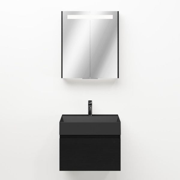 Greeploos badkamermeubel in de kleur zwart mat eiken is 60 cm breed. De wastafel is vervaardig in keramiek en heeft de kleur antraciet mat keramiek. Dit badkamermeubel met deze wastafel is leverbaar tussen de 60 cm t/m 160 cm