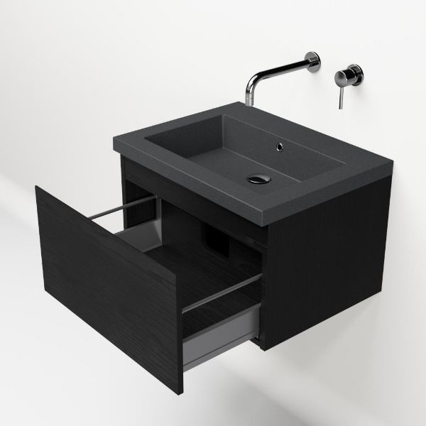 Greeploos badkamermeubel in de kleur zwart mat eiken is 60 cm breed.  De wastafel is vervaardig in quartz en heeft de kleur grijs mat quartz. Dit badkamermeubel met deze wastafel is leverbaar tussen de 60 cm t/m 160 cm