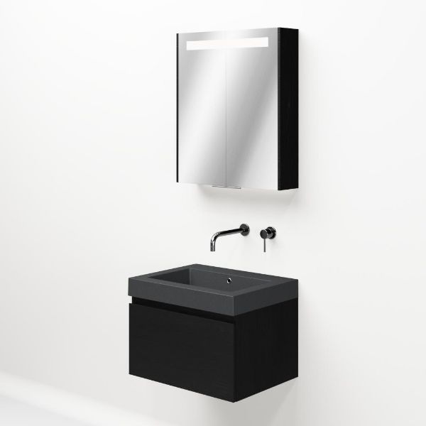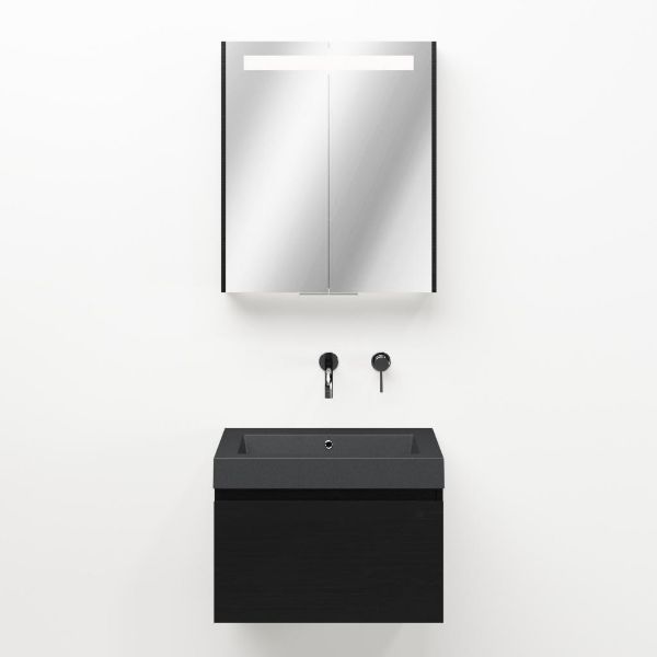 Greeploos badkamermeubel in de kleur zwart mat eiken is 60 cm breed. De wastafel is vervaardig in quartz en heeft de kleur grijs mat quartz. Dit badkamermeubel met deze wastafel is leverbaar tussen de 60 cm t/m 160 cm