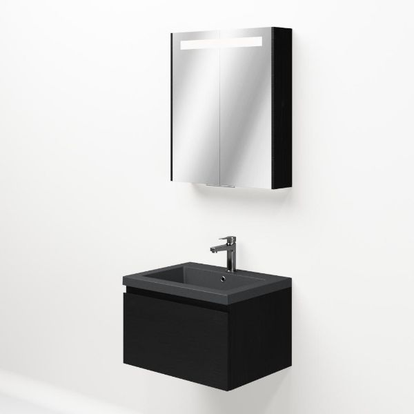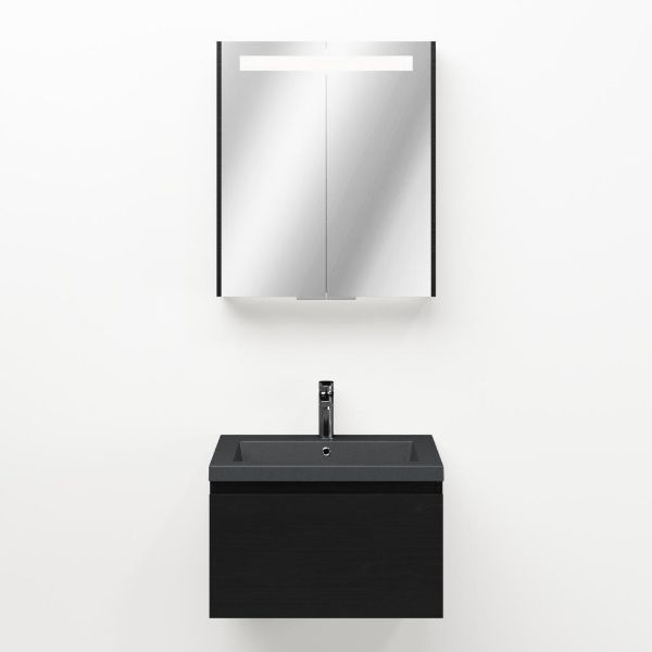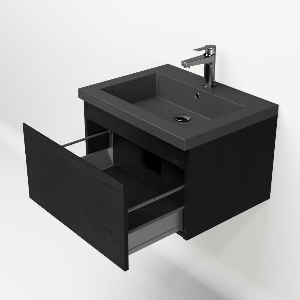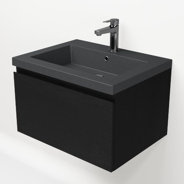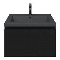 Greeploos badkamermeubel in de kleur zwart mat eiken is 60 cm breed.  De wastafel is vervaardig in quartz en heeft de kleur grijs mat quartz. Dit badkamermeubel met deze wastafel is leverbaar tussen de 60 cm t/m 160 cm