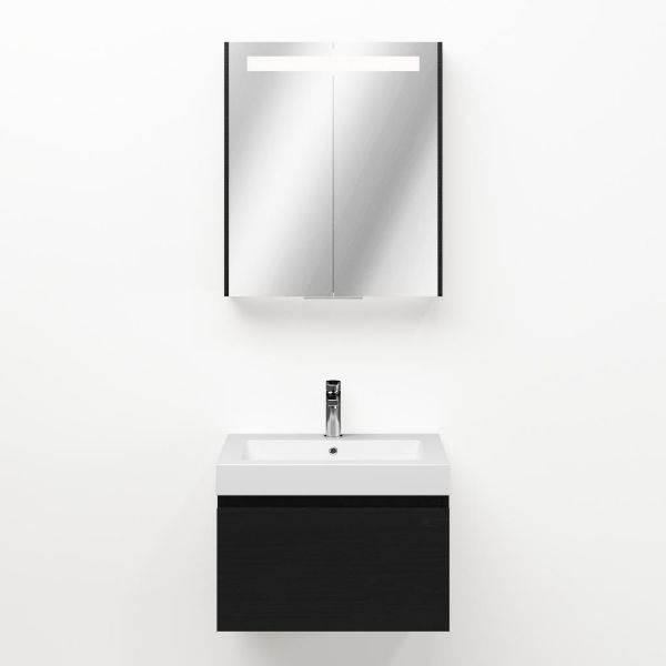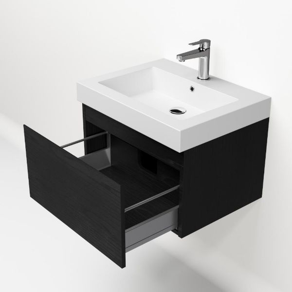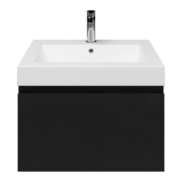 Greeploos badkamermeubel in de kleur zwart mat eiken is 60 cm breed. De wastafel is vervaardig in quartz en heeft de kleur wit mat quartz. Dit badkamermeubel met deze wastafel is leverbaar tussen de 60 cm t/m 160 cm