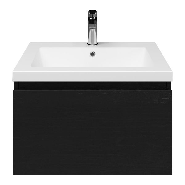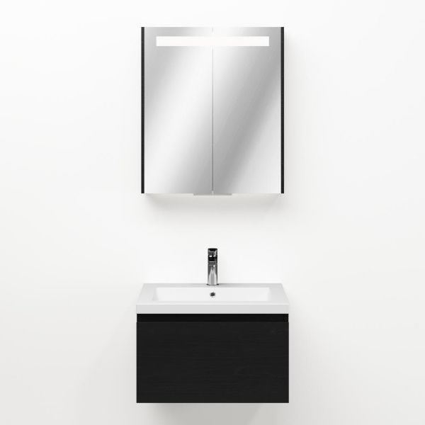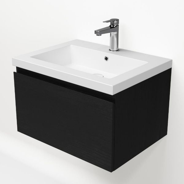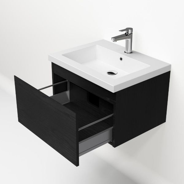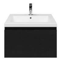 Greeploos badkamermeubel in de kleur zwart mat eiken is 60 cm breed. De wastafel is vervaardig in quartz en heeft de kleur wit mat quartz. Dit badkamermeubel met deze wastafel is leverbaar tussen de 60 cm t/m 160 cm
