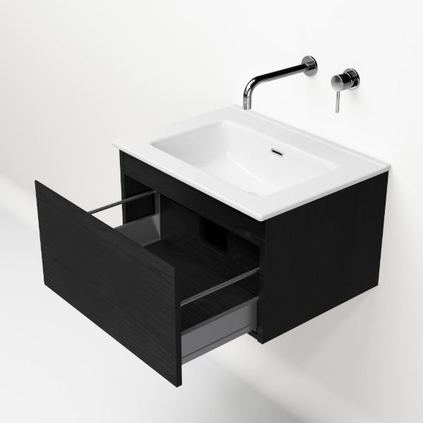 | Bellanti Solo/Etna badmeubel 60x46 1 softclose lade mat zwart eiken greeploos keramische wastafel wit zonder kraangaten |