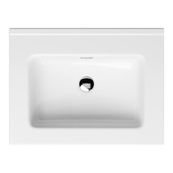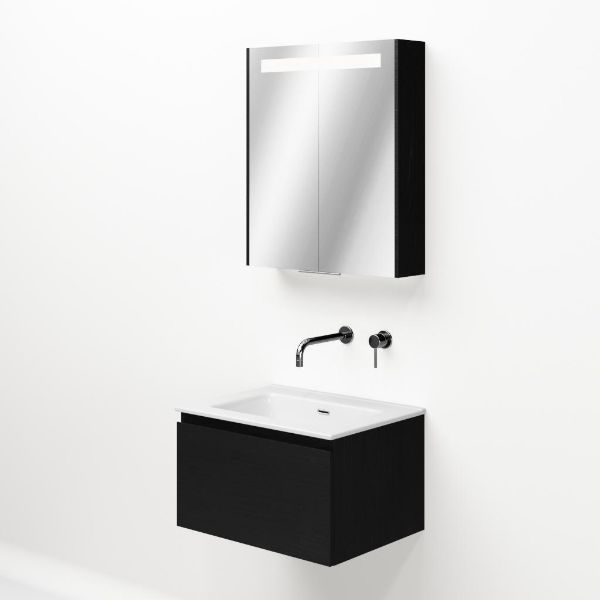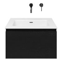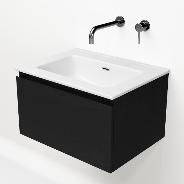 Greeploos badkamermeubel in de kleur zwart mat eiken is 60 cm breed. De wastafel is vervaardig in keramiek en heeft de kleur wit keramiek. Dit badkamermeubel met deze wastafel is leverbaar tussen de 60 cm t/m 120 cm