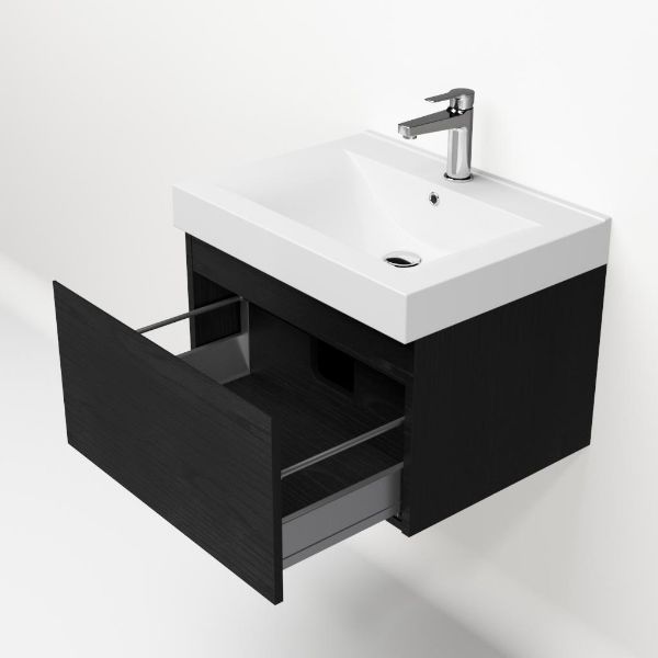 | | Bellanti Solo/Wave badmeubel 60x46 1 softclose lade mat zwart eiken greeploos polystone wastafel wit met 1 kraangat |