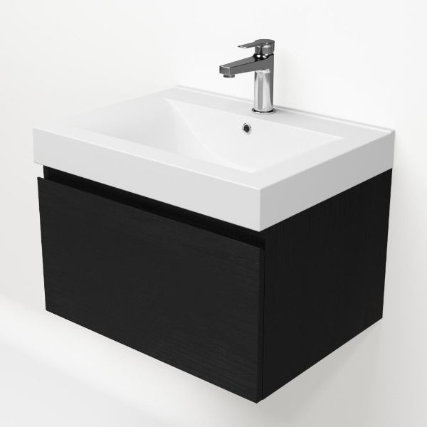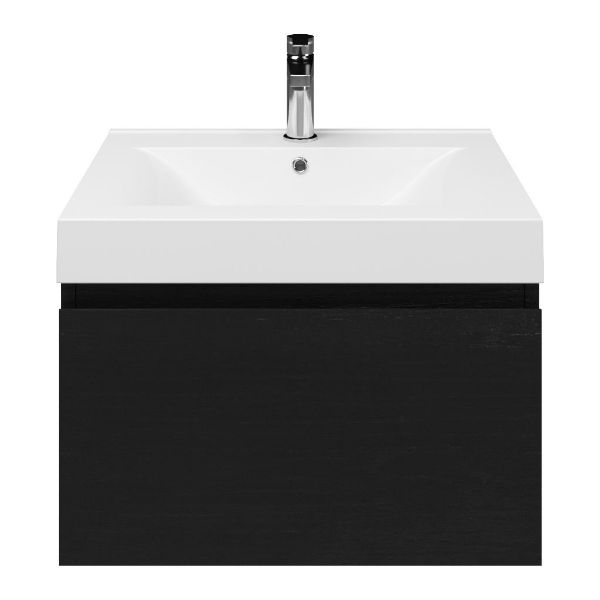 Greeploos badkamermeubel in de kleur zwart mat eiken is 60 cm breed. De wastafel is vervaardig in polystone en heeft de kleur wit. Dit badkamermeubel met deze wastafel is leverbaar tussen de 60 cm t/m 120 cm