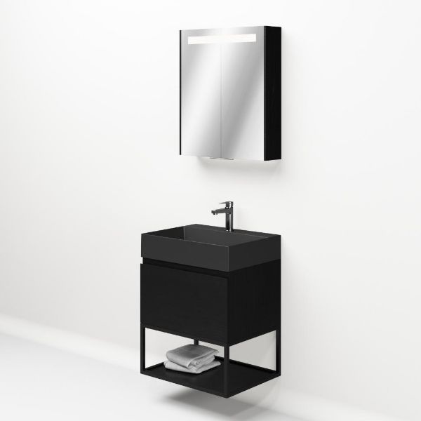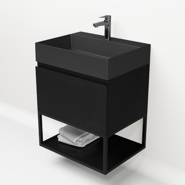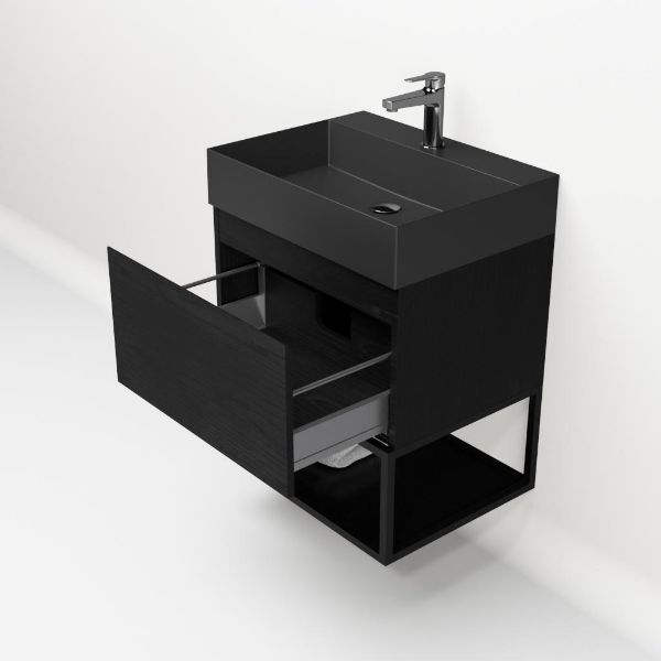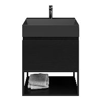 | | Bellanti Solo/Tela/Azzurra badmeubel 60x46 1 softclose lade mat zwart eiken greeploos keramische wastafel antraciet mat met 1 kraangat met mat zwart metalen frame |
