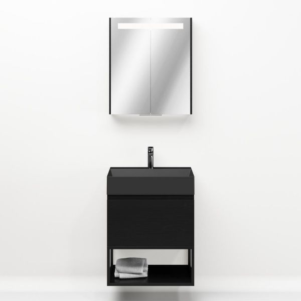 Greeploos badkamermeubel in de kleur zwart mat eiken is 60 cm breed. De wastafel is vervaardig in keramiek en heeft de kleur antraciet mat keramiek. Dit badkamermeubel met deze wastafel is leverbaar tussen de 60 cm t/m 140 cm