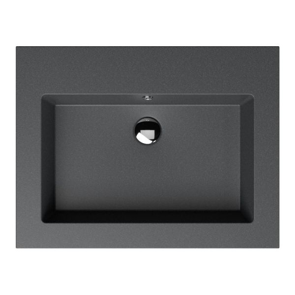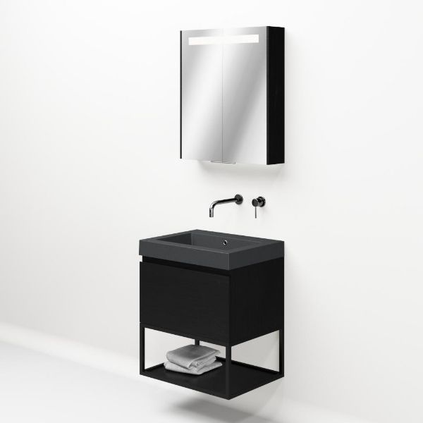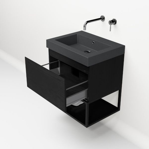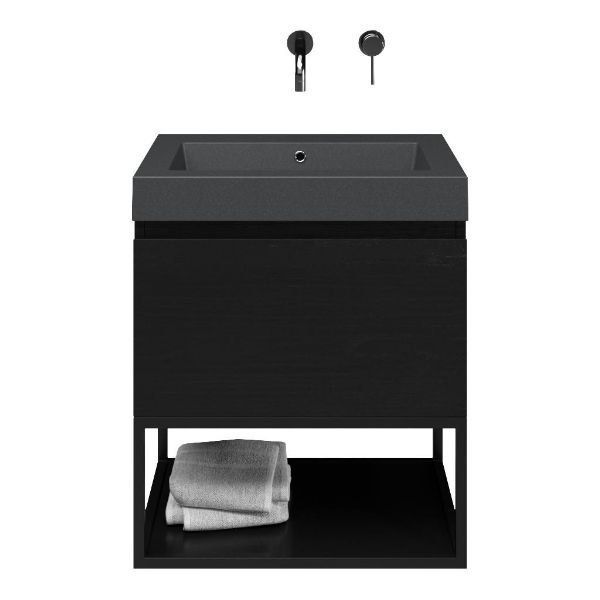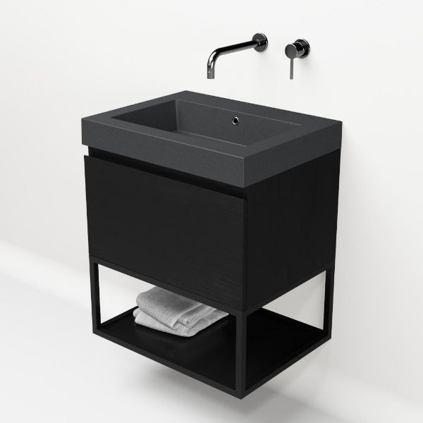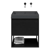 | | Bellanti Solo/Tela/Esta-Q badmeubel 60x46 1 softclose lade mat zwart eiken greeploos quartz wastafel mat grijs zonder kraangaten met mat zwart metalen frame |