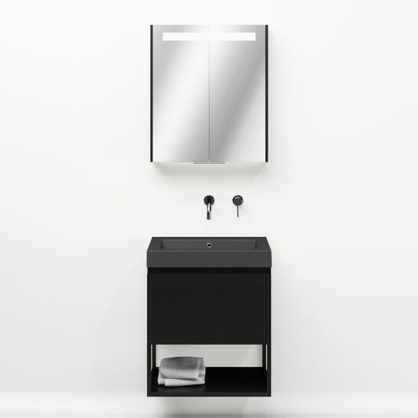 Greeploos badkamermeubel in de kleur zwart mat eiken is 60 cm breed. De wastafel is vervaardig in quartz en heeft de kleur grijs mat quartz. Dit badkamermeubel met deze wastafel is leverbaar tussen de 60 cm t/m 160 cm