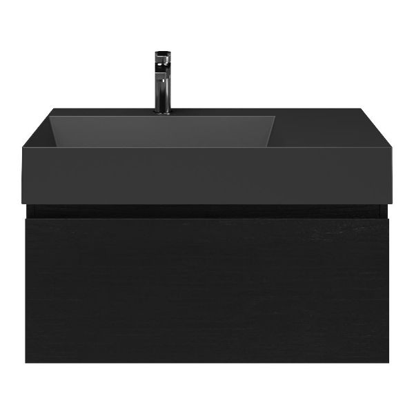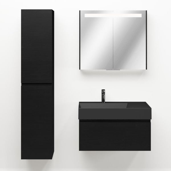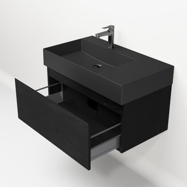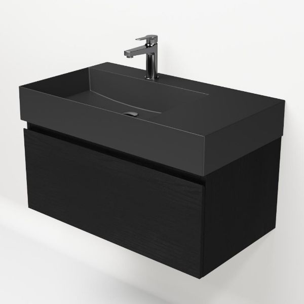 Greeploos badkamermeubel in de kleur zwart mat eiken is 80 cm breed. De wastafel is vervaardig in keramiek en heeft de kleur antraciet mat keramiek. Dit badkamermeubel met deze wastafel is leverbaar tussen de 60 cm t/m 160 cm