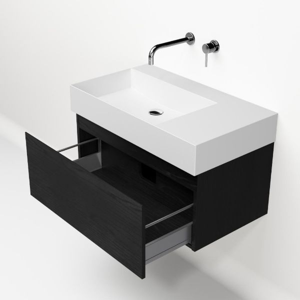 | | Bellanti Solo/Azzurra badmeubel 80x46 1 softclose lade mat zwart eiken greeploos keramische wastafel links wit mat zonder kraangaten |
