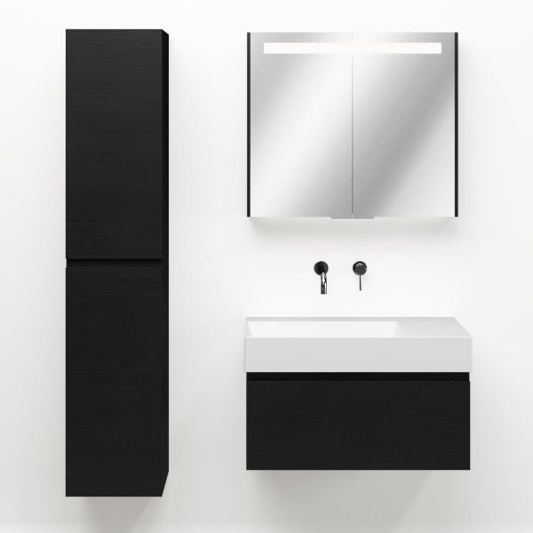 Greeploos badkamermeubel in de kleur zwart mat eiken is 80 cm breed. De wastafel is vervaardig in keramiek en heeft de kleur wit mat keramiek. Dit badkamermeubel met deze wastafel is leverbaar tussen de 60 cm t/m 160 cm