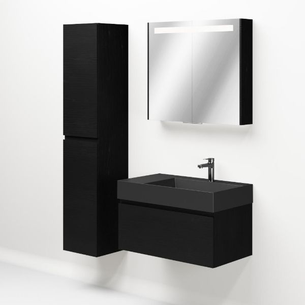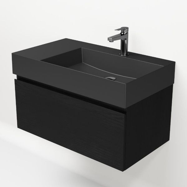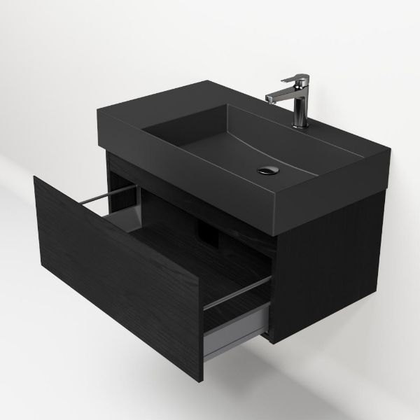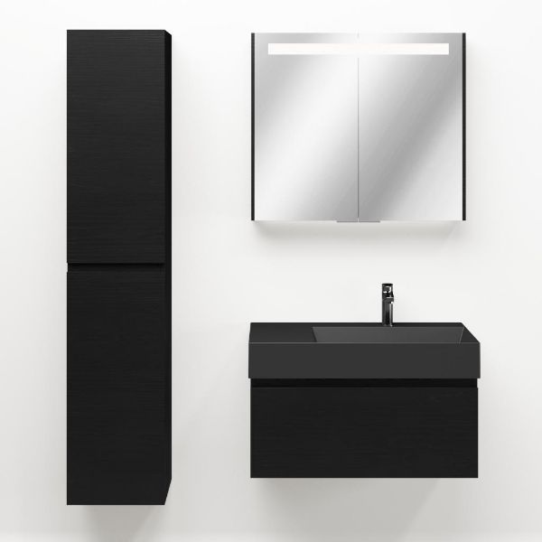 Greeploos badkamermeubel in de kleur zwart mat eiken is 80 cm breed. De wastafel is vervaardig in keramiek en heeft de kleur antraciet mat keramiek. Dit badkamermeubel met deze wastafel is leverbaar tussen de 60 cm t/m 160 cm