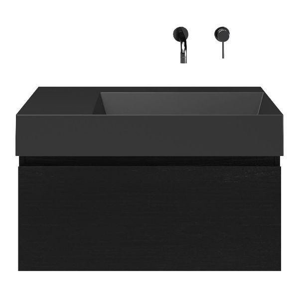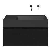 Greeploos badkamermeubel in de kleur zwart mat eiken is 80 cm breed. De wastafel is vervaardig in keramiek en heeft de kleur antraciet mat keramiek. Dit badkamermeubel met deze wastafel is leverbaar tussen de 60 cm t/m 160 cm