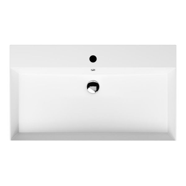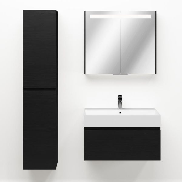 Greeploos badkamermeubel in de kleur zwart mat eiken is 80 cm breed. De wastafel is vervaardig in keramiek en heeft de kleur wit mat keramiek. Dit badkamermeubel met deze wastafel is leverbaar tussen de 60 cm t/m 160 cm