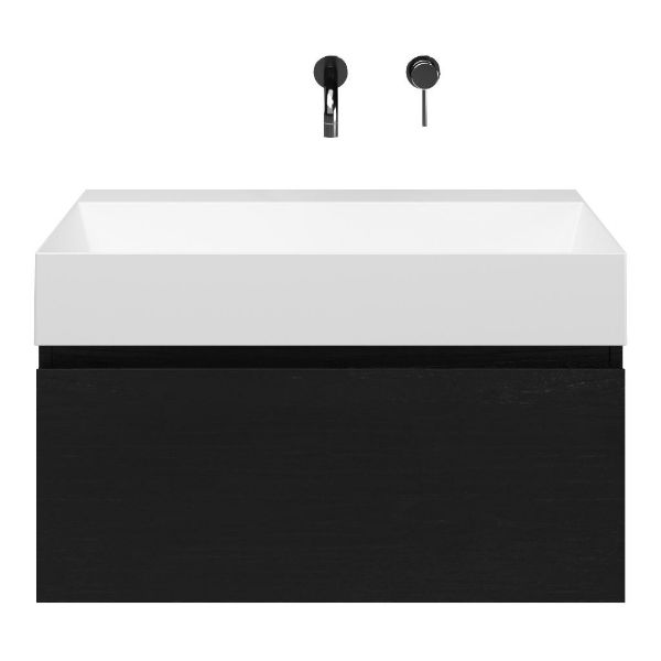 Greeploos badkamermeubel in de kleur zwart mat eiken is 80 cm breed. De wastafel is vervaardig in keramiek en heeft de kleur wit mat keramiek. Dit badkamermeubel met deze wastafel is leverbaar tussen de 60 cm t/m 160 cm
