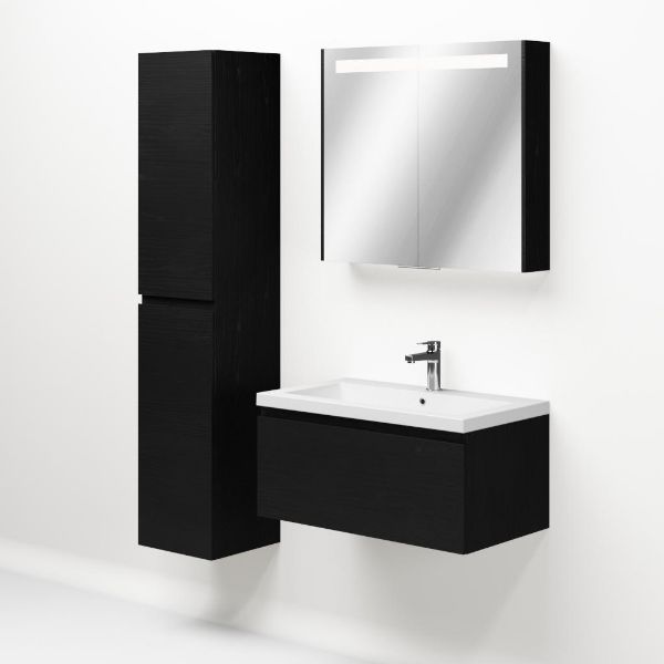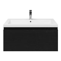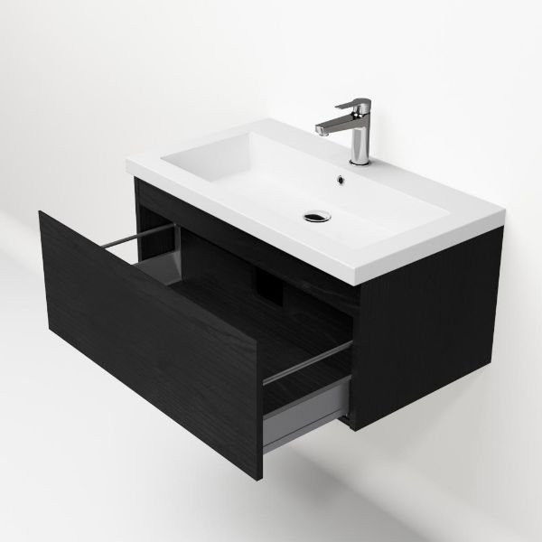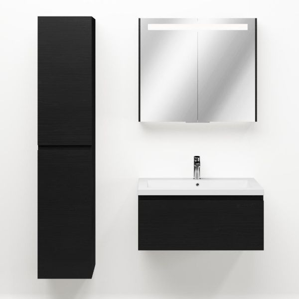 Greeploos badkamermeubel in de kleur zwart mat eiken is 80 cm breed.  De wastafel is vervaardig in polystone en heeft de kleur wit. Dit badkamermeubel met deze wastafel is leverbaar tussen de 60 cm t/m 160 cm
