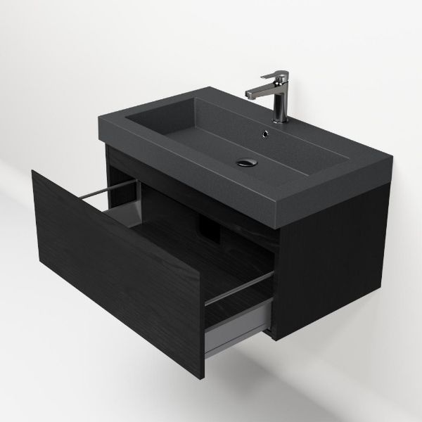 | | Bellanti Solo/Esta-Q badmeubel 80x46 1 softclose lade mat zwart eiken greeploos quartz wastafel mat grijs met 1 kraangat |