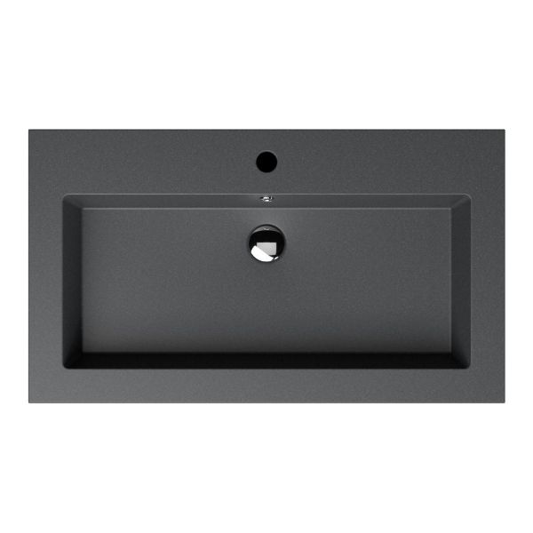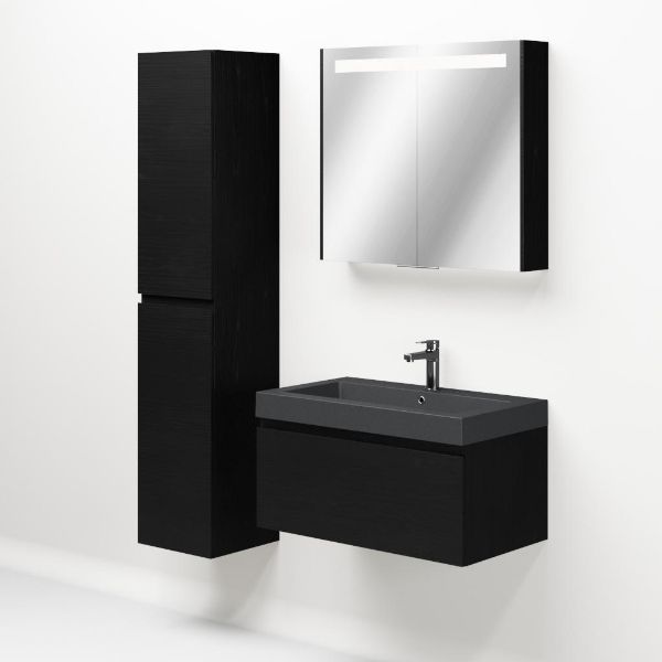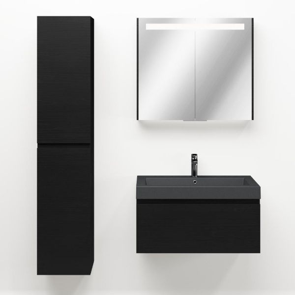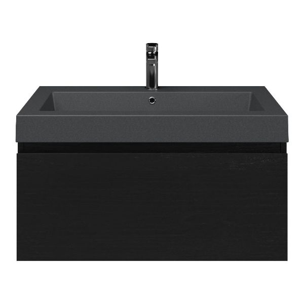 Greeploos badkamermeubel in de kleur zwart mat eiken is 80 cm breed. De wastafel is vervaardig in quartz en heeft de kleur grijs mat quartz. Dit badkamermeubel met deze wastafel is leverbaar tussen de 60 cm t/m 160 cm