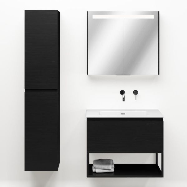 Greeploos badkamermeubel in de kleur zwart mat eiken is 80 cm breed. De wastafel is vervaardig in keramiek en heeft de kleur wit keramiek. Dit badkamermeubel met deze wastafel is leverbaar tussen de 60 cm t/m 120 cm