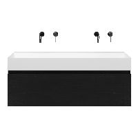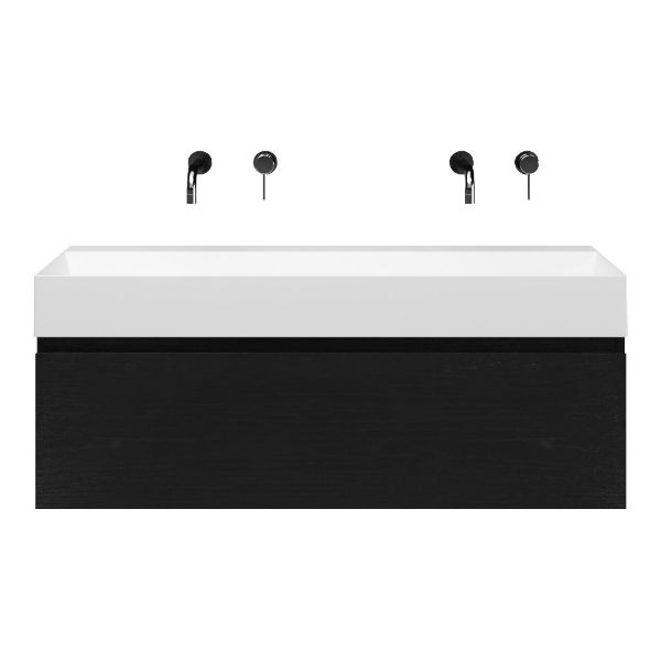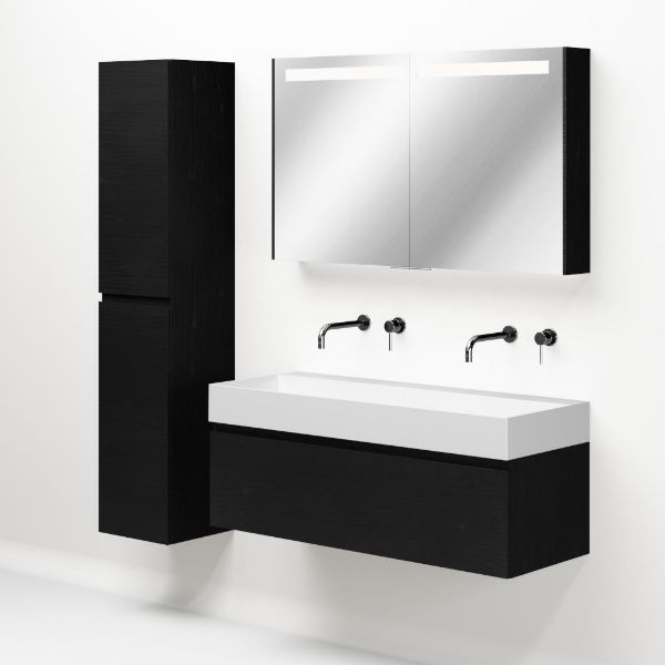 Greeploos badkamermeubel in de kleur zwart mat eiken is 120 cm breed. De wastafel is vervaardig in keramiek en heeft de kleur wit mat keramiek. Dit badkamermeubel met deze wastafel is leverbaar tussen de 60 cm t/m 160 cm