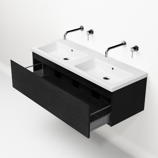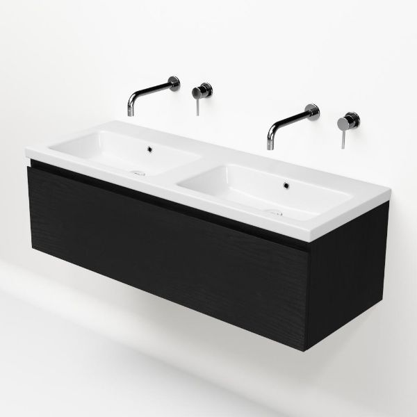 | Bellanti Solo/Amelia badmeubel 120x46 1 softclose lade mat zwart eiken greeploos keramische wastafel dubbel wit glans zonder kraangaten |