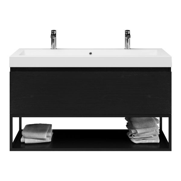 Greeploos badkamermeubel in de kleur zwart mat eiken is 120 cm breed.  De wastafel is vervaardig in polystone en heeft de kleur wit. Dit badkamermeubel met deze wastafel is leverbaar tussen de 60 cm t/m 160 cm