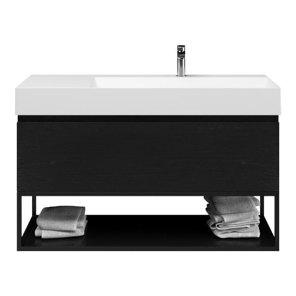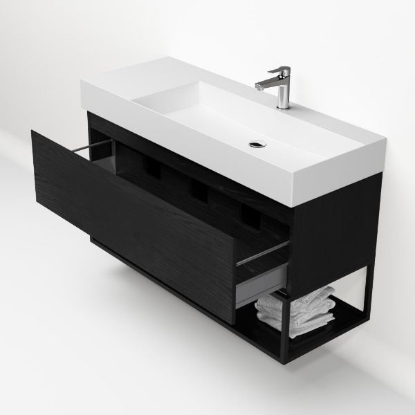 | | Bellanti Solo/Tela /Azzurra badmeubel 120x46 1 softclose lade mat zwart eiken greeploos keramische wastafel rechts mat wit met 1 kraangat met mat zwart metalen frame |