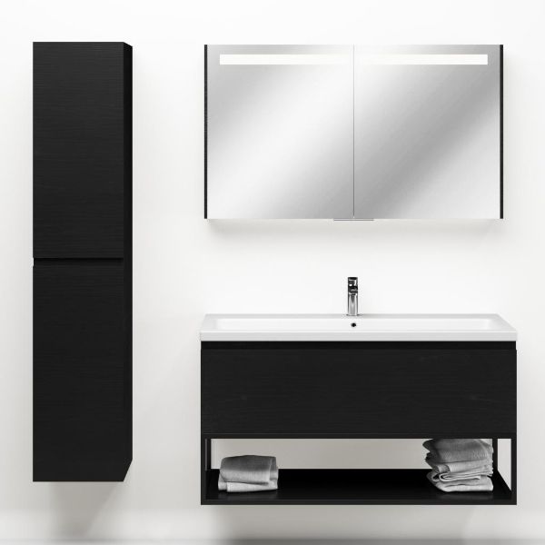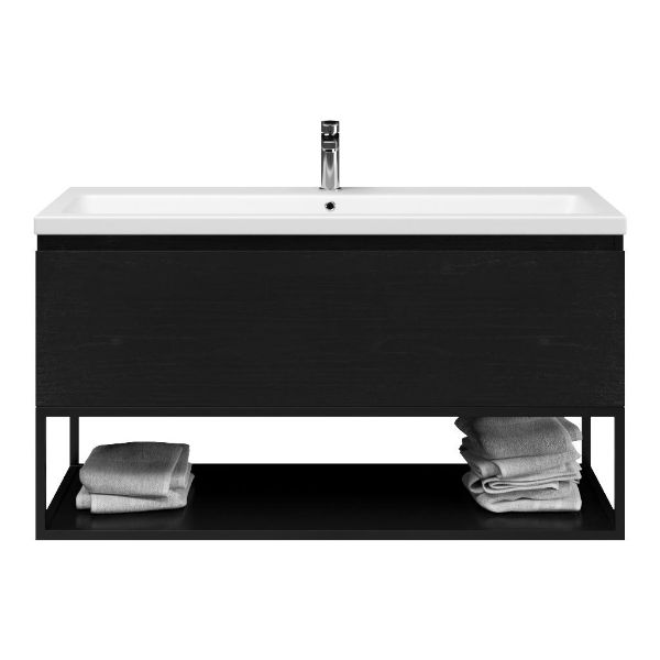 | | Bellanti Solo/Tela /Amelia badmeubel 120x46 1 softclose lade mat zwart eiken greeploos keramische wastafel wit mat met 1 kraangat met mat zwart metalen frame |