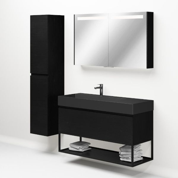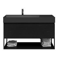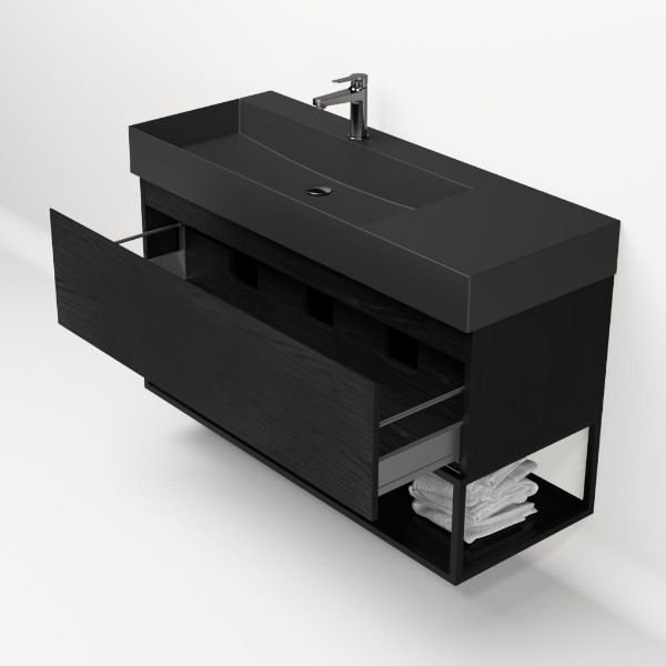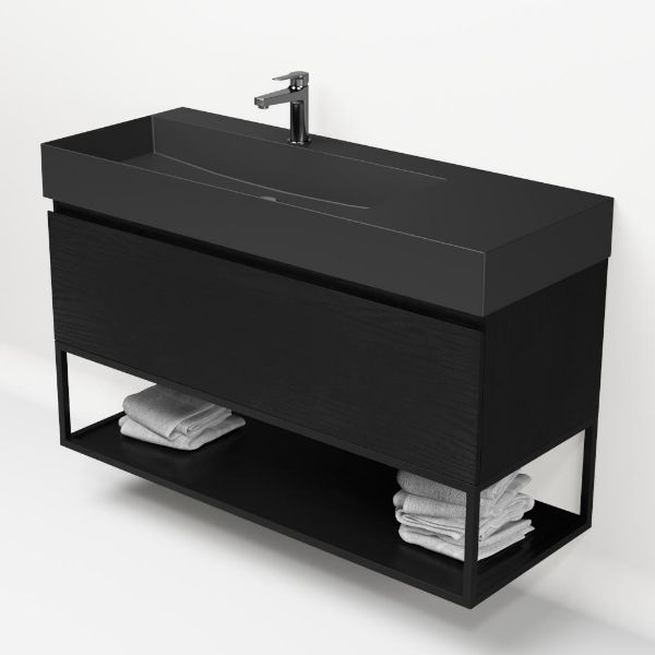 | | Bellanti Solo/Tela /Azzurra badmeubel 120x46 1 softclose lade mat zwart eiken greeploos keramische wastafel links antraciet mat met 1 kraangat met mat zwart metalen frame |