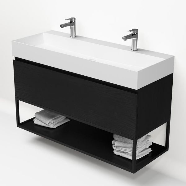 | | Bellanti Solo/Tela /Azzurra badmeubel 120x46 1 softclose lade mat zwart eiken greeploos keramische wastafel wit mat met 2 kraangaten met mat zwart metalen frame |