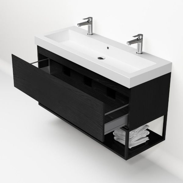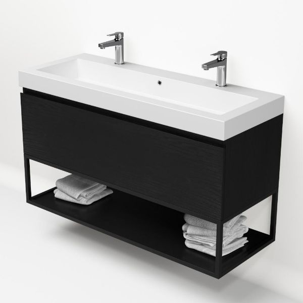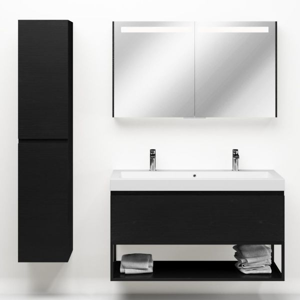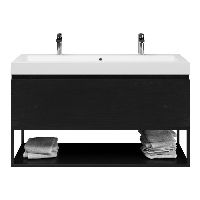 | | Bellanti Solo/Tela/Esta-Q badmeubel 120x46 1 softclose lade mat zwart eiken greeploos quartz wastafel mat wit met 2 kraangaten met mat zwart metalen frame |