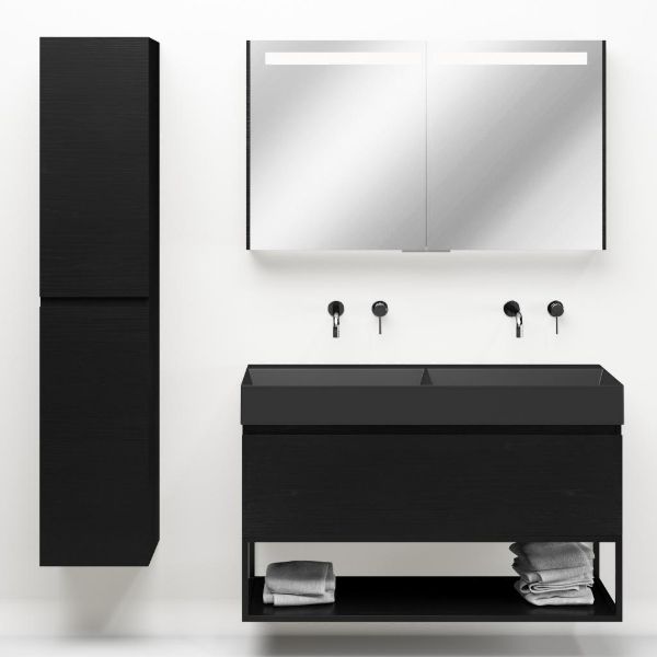 Greeploos badkamermeubel in de kleur zwart mat eiken is 120 cm breed. De wastafel is vervaardig in keramiek en heeft de kleur antraciet mat keramiek. Dit badkamermeubel met deze wastafel is leverbaar tussen de 60 cm t/m 140 cm