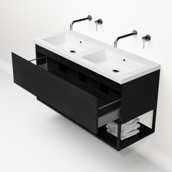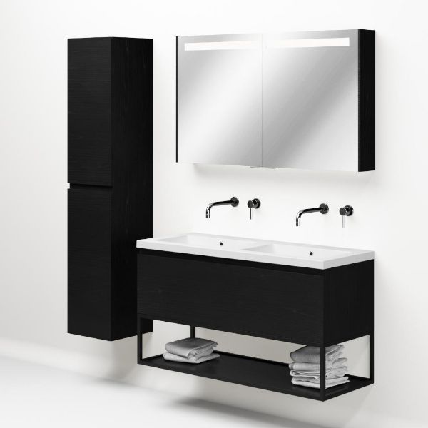 | | Bellanti Solo/Tela/Esta badmeubel 120x46 1 softclose lade mat zwart eiken greeploos polystone wastafel dubbel wit zonder kraangaten met mat zwart metalen frame |