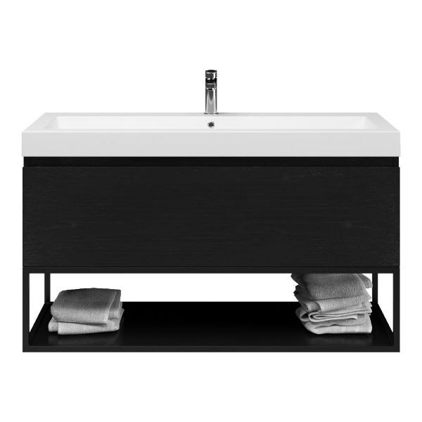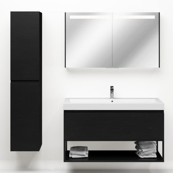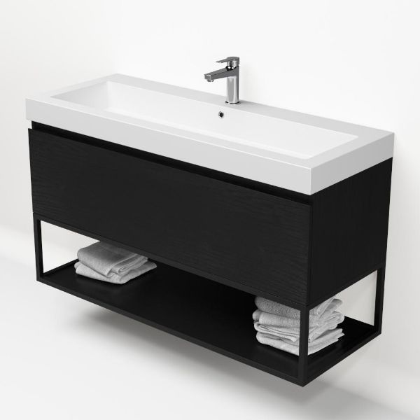 | | Bellanti Solo/Tela/Esta-Q badmeubel 120x46 1 softclose lade mat zwart eiken greeploos quartz wastafel mat wit met 1 kraangat met mat zwart metalen frame |