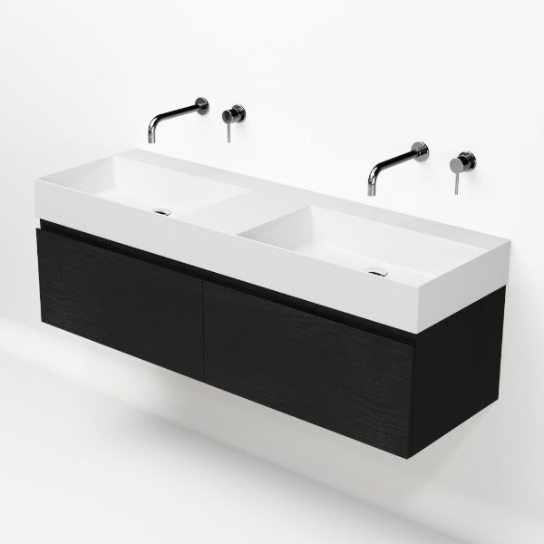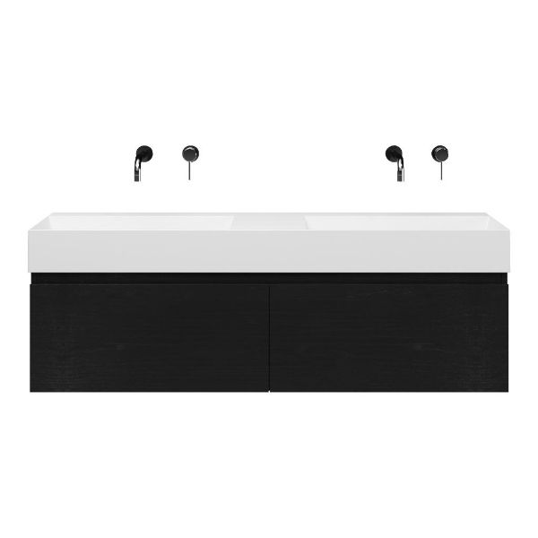 | | Bellanti Solo/Azzurra badmeubel 140x46 2 softclose laden mat zwart eiken greeploos keramische wastafel dubbel wit glans zonder kraangaten |
