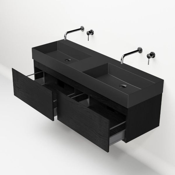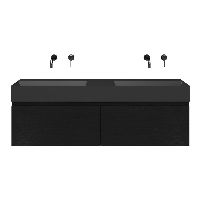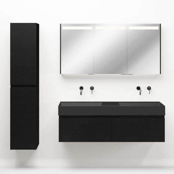 Greeploos badkamermeubel in de kleur zwart mat eiken is 140 cm breed. De wastafel is vervaardig in keramiek en heeft de kleur zwart mat. Dit badkamermeubel met deze wastafel is leverbaar tussen de 60 cm t/m 160 cm