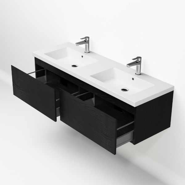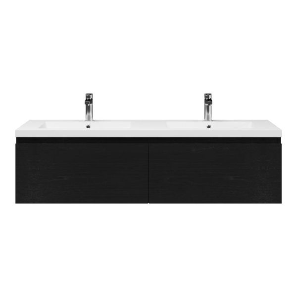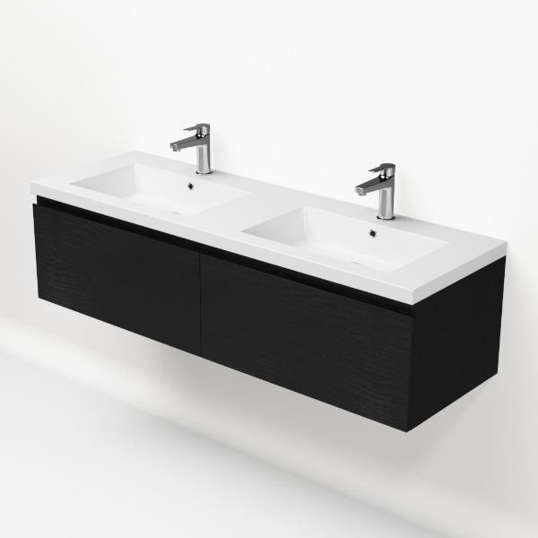 | | Bellanti Solo/Esta badmeubel 140x46 2 softclose laden mat zwart eiken greeploos polystone wastafel dubbel wit met 2 kraangaten |