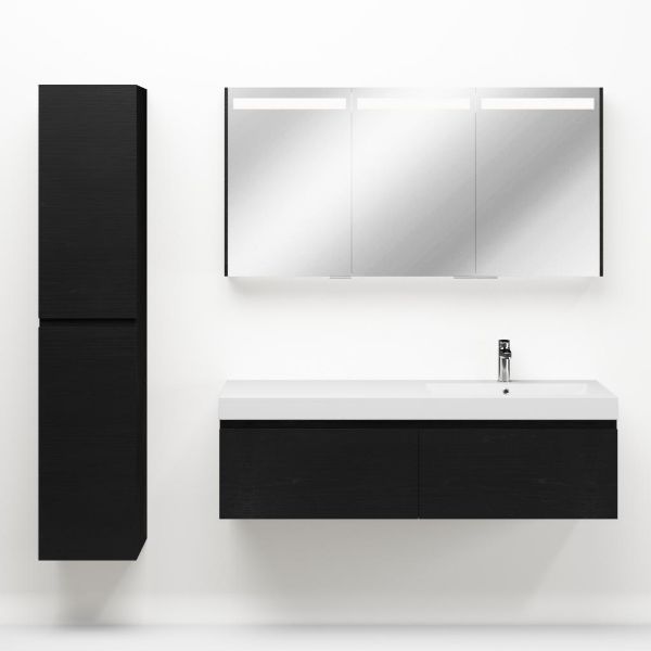 Greeploos badkamermeubel in de kleur zwart mat eiken is 140 cm breed. De wastafel is vervaardig in polystone en heeft de kleur wit. Dit badkamermeubel met deze wastafel is leverbaar tussen de 60 cm t/m 160 cm