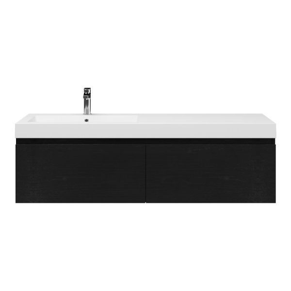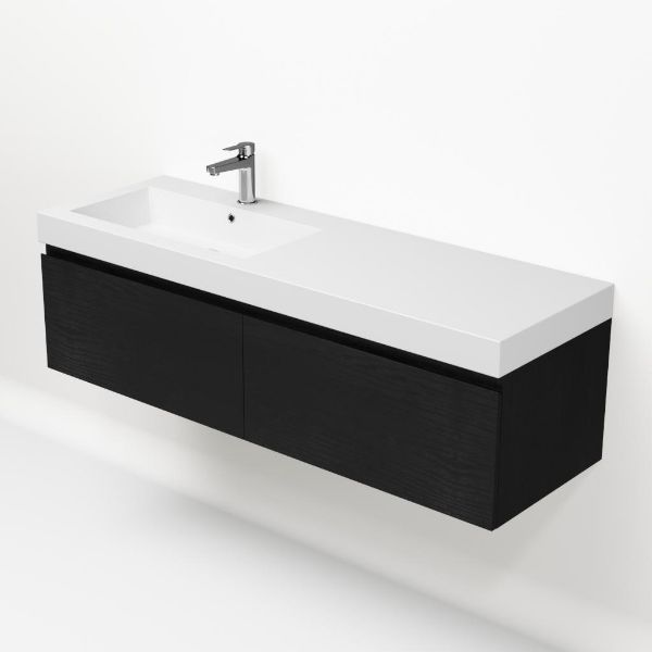 Greeploos badkamermeubel in de kleur zwart mat eiken is 140 cm breed. De wastafel is vervaardig in polystone en heeft de kleur wit. Dit badkamermeubel met deze wastafel is leverbaar tussen de 60 cm t/m 160 cm
