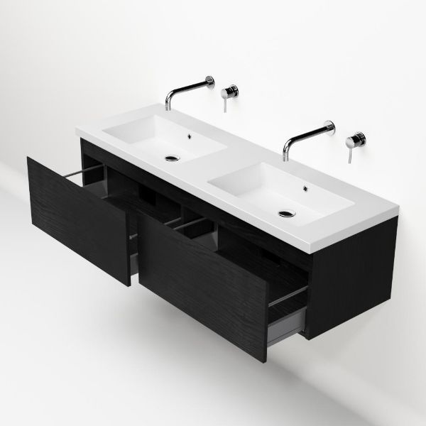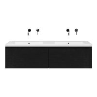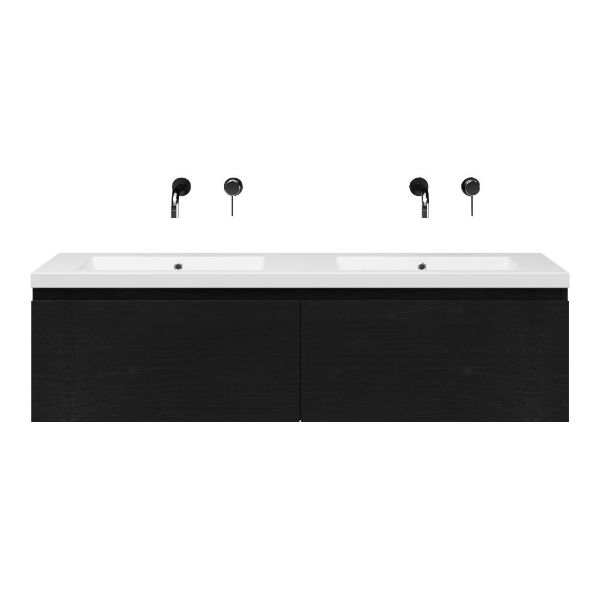 | | Bellanti Solo/Esta-Q badmeubel 140x46 2 softclose laden mat zwart eiken greeploos quartz wastafel dubbel mat wit zonder kraangaten |